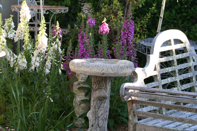 Birdbath and teak bench